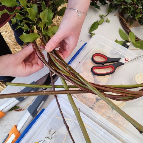 Inside the marquee, tables were piled with everything nature had gifted us that season: willow, bay leaves, pinecones, dried stems and sprigs, and just enough red ribbon to tie a festive bow on each creation. It smelled like winter woods — earthy, fresh, and comforting. All of it was harvested from the canal and its surroundings, reminding us how much beauty sits quietly beside us, waiting to be used in ways that bring the community together.
