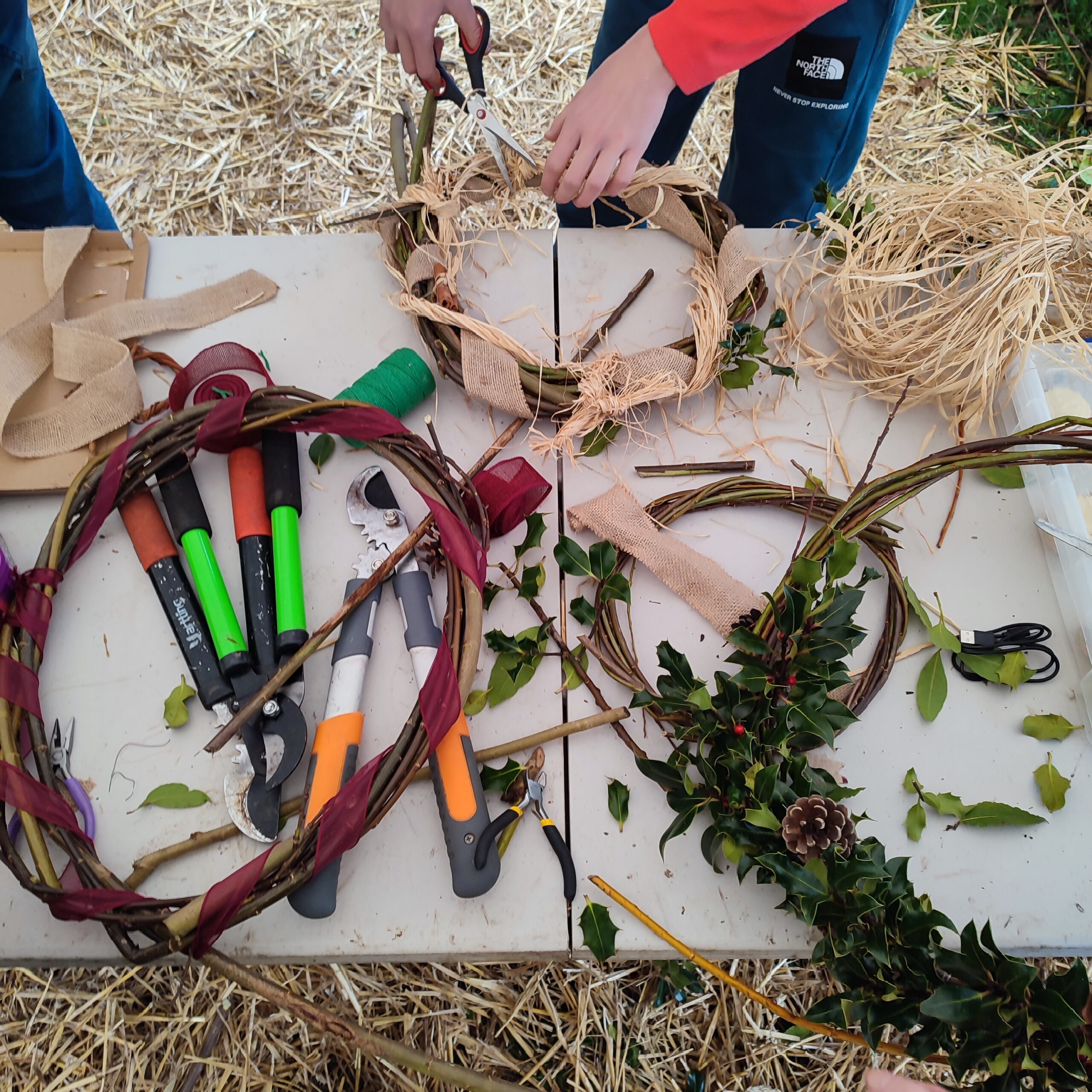 Inside the marquee, tables were piled with everything nature had gifted us that season: willow, bay leaves, pinecones, dried stems and sprigs, and just enough red ribbon to tie a festive bow on each creation. It smelled like winter woods — earthy, fresh, and comforting. All of it was harvested from the canal and its surroundings, reminding us how much beauty sits quietly beside us, waiting to be used in ways that bring the community together.